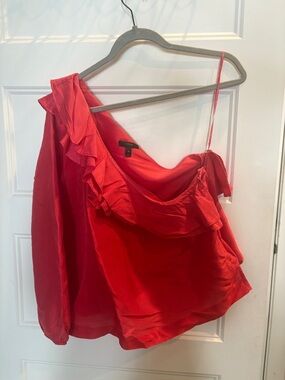 Bright red satin one-shoulder top. Features ruffle trim and a delicate spaghetti strap. Lightweight and flowy. Feminine and chic.
