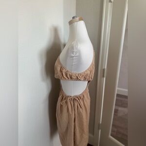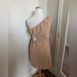 Elegant one-shoulder tan dress with a stylish cut-out design. Perfect for any occasion.