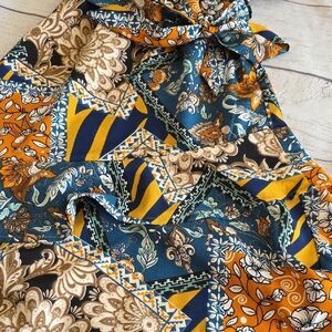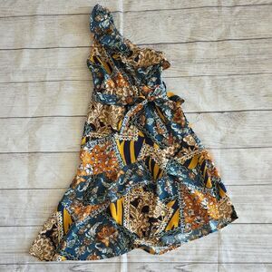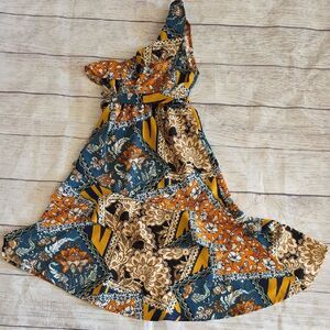Stylish one-shoulder dress with a vibrant floral print. Features a mix of blue, yellow, and brown colors. Perfect for a chic look.
