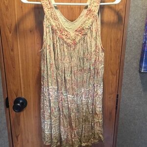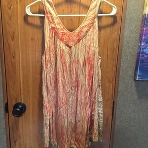 Sakkas brand women’s sleeveless top or cover up. Beige/tan background with splatters of orange and green. This is a one-size-fits most piece of 100% rayon with crinkling. Decorative soutache stitching on v-neck and at hem front with gold beaded sequins; back side is plain. Great with jeans, shorts or wear over your swimsuit! Showing photos of front and back sides along with fiber content tag.