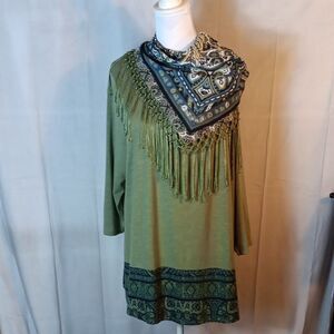 Stylish green tunic long sleeve top paired with a patterned scarf. Size XXL with a pit to pit measuring 25" and a length of 31". Features fringe details and intricate designs.