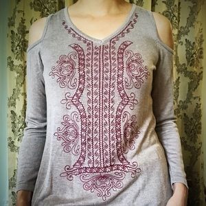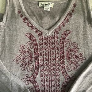 Extremely soft and comfortable never worn blouse. About 25” long from top to bottom. 17” across front chest. Flared at bottom.