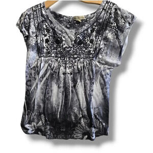 One World live and let live women's short sleeves VNeck boho shirt - small