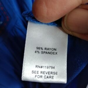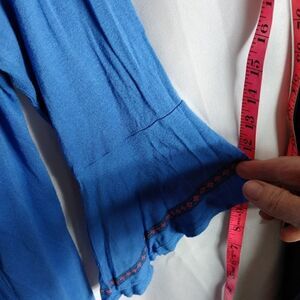 blue tunic with embroidered neckline. rayon spandex blend, loose bell sleeves. chest 19" length 29". KK