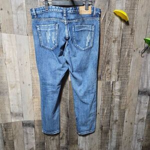 Details: medium wash, low rise, skinny fit, factory rips and distress, no stretch, front and back pockets, zip fly