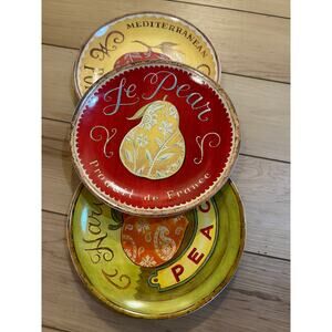 Add a touch of contemporary elegance to your dining table with this stunning set of three round salad plates from the Oneida Angela Staehling Art in Motion ALA MODE collection. The plates feature a beautiful fruit-themed pattern and are made of high-quality stoneware that is dishwasher safe for your convenience. Each plate measures 8 1/4 inches in diameter and is part of the Oneida product line. Ideal for all occasions, this salad plate set is perfect for any meal, whether it's a casual lunch or a formal dinner. The plates come with a printed backstamp and are in excellent condition, ready to be used and admired. Don't miss out on the opportunity to add these gorgeous plates to your collection today! Plates are so gorgeous and unique, tags on bottom, NEW!