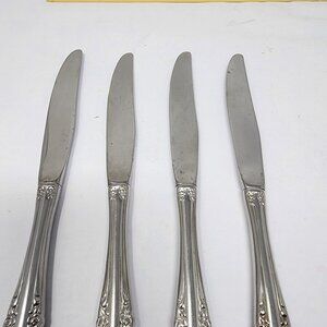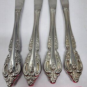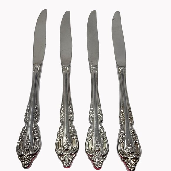 This set of four Oneida Brahms stainless steel knives features an intricate, ornate design. Ideal for enhancing table settings with elegance.