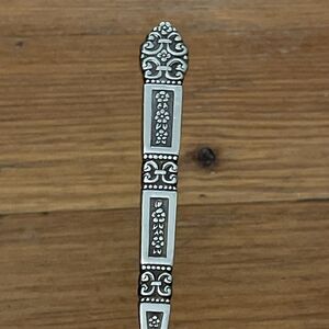 Stainless flatware bundle of a dinner fork and oval soup spoon in the Coronation with Black Accent pattern by Oneida. The fork measures 7 3/8" and the spoon 6 3/4". Dishwasher safe. Both pieces are pre-owned with some surface scratches from normal use.