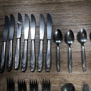 27 pieces of Roseanne rose pattern by Oneida. Stainless steel.
