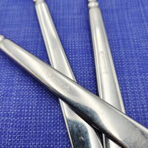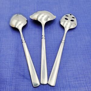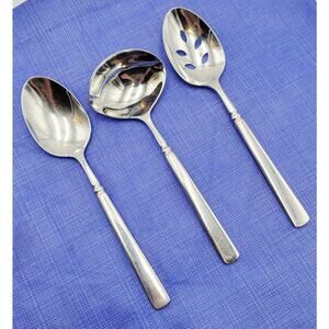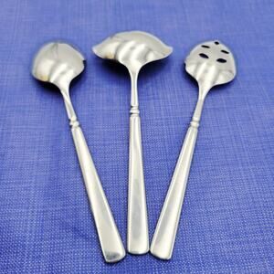 The Oneida Easton Cube Set of 3 Hostess Serving Set is a vintage collection featuring a CUBE mark. This set includes a slotted spoon, ladle, and serving spoon, all made of durable stainless steel with a solid handle design. The reusable and dishwasher-safe utensils are perfect for serving and styling dishes in style, adding a touch of elegance to any dining experience. Perfect for those looking for a classic and practical serving set for their kitchen or dining room.
