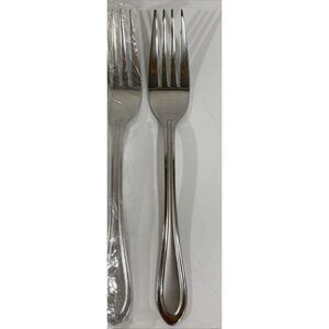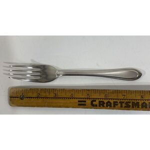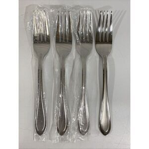 The product is a set of four Oneida Joann dinner forks, each 8 inches in length. Made of stainless steel with a traditional style, the forks have a glossy & satin finish and feature a solid handle pattern. Ideal for adults, this silver dinner fork set is a stylish addition to any dining table.