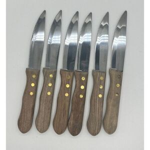 Oneida PIONEER Wood Handle Serrated Steak Knives Stainless Steel Blade Set Of 6
