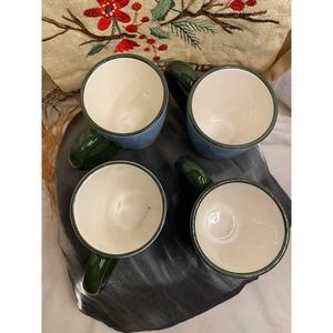 Oneida, Set of Four (4), Christmas / Snowman / Holiday Mugs / Cups. Two designs of “Snow Family” (Mom, Dad, Kid and /Cat). 2004 Warren Kimble. Pale blue background with white snow and multicolor accents. Heavy, Quality mugs with fat ear handle, (I said it.)