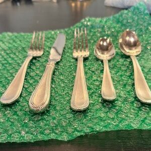 Oneida Paul Revere stainless steel flatware 5-piece place setting in gently used condition. Classic colonial design featuring a traditional beaded edge and timeless styling.