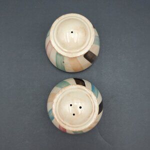 Oneida Teramo Stripes Salt and Pepper Shakers. Excellent pre-owned condition featuring brushstroke stripes of green, purple, red, blue, and salmon on cream with a slightly distressed look. 3" tall and 3" at the base. I also have latte mugs, a sugar bowl, and pitcher in this pattern. Please check with me before bundling due to weight.