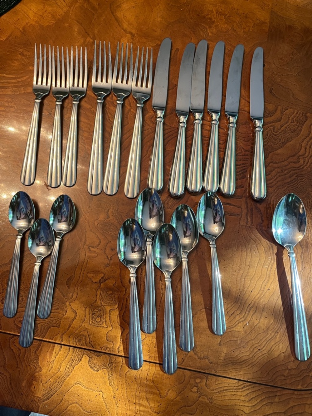 3 full 5 piece sets of Oneida Unity 18/10 flatware plus additional knives spoons and serving spoon. 21 pieces total. Good used condition.