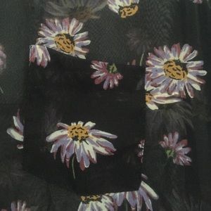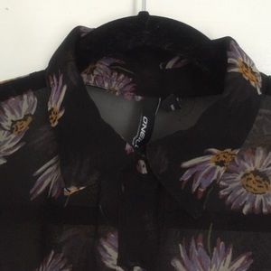 Sheer, loose black fabric with purpleish daisies. Button up with a pocket and short sleeves.