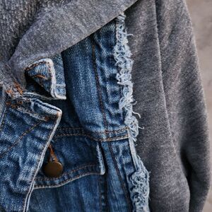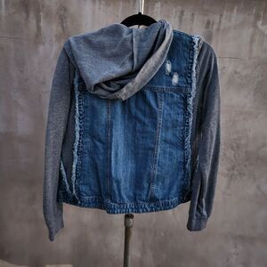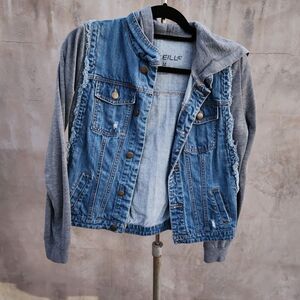 layered look distressed denim and fleece jacket with hood. Gently preloved. no flaws