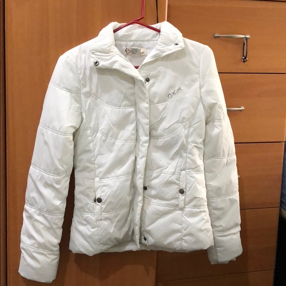 Slightly used O'Neill whitish ivory jacket. Light weight and warm. Perfect for a chilly fall day. Silver embroidered accents throughout. Only flaw is a small stain on the bottom left of the front as seen in picture.