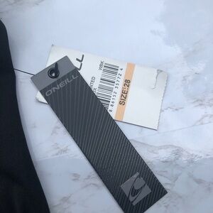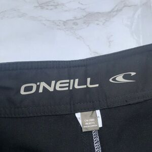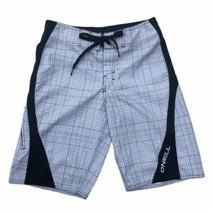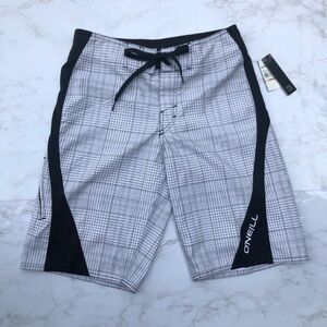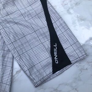 O’neill men’s swim board shorts. Black upper with gray and white plaid bottoms. Velcro fly. Ties at waist for an adjustable fit. No liner. See pics for measurements. Waist size 28 inches. New with tags! No flaws.