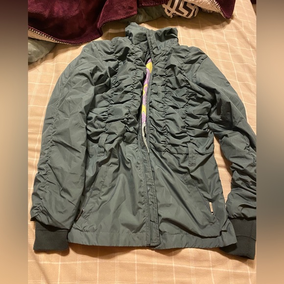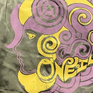 Shiny side has the womanly yellow and purple graphic head with hair made of waves. Has splotchy wear unless that’s how the graphic was made. Has zipped chest pocket and tags sticking out.