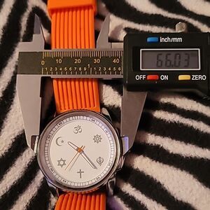 From Oneness University. silver case, white face with grey religious/spiritual symbols on the face instead of numbers. Like that bumper sticker that says "coexist".