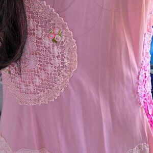 Float into a dream in this exquisite, one-of-a-kind handmade slip dress, a true embodiment of romantic, ultra-feminine style! Crafted from a symphony of vintage lace and fabrics in lush mauve-rose-pink and raspberry rose tones, this dress is designed to enchant. Its flattering V-neckline blossoms with handmade rose blossoms in rich burgundy and rose-pink, leading to a stunning center panel of chiffon featuring richly embroidered flower and scrollwork.
