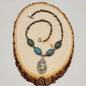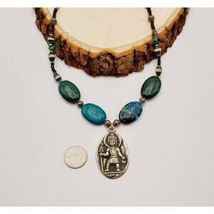 One-of-kind Standing Shiva metal pendant, 4 Chrysocolla stone beads, wrapped paper beads, malachite chips, metal beads and glass seed beads. This is a relatively heavy necklace 3.1 oz.