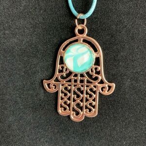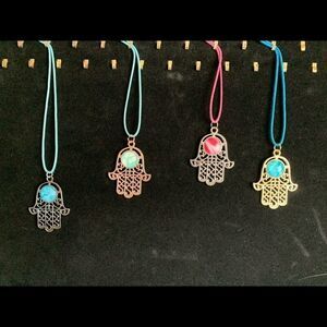 I have created these colors by mixing and designing patterns with acrylic paint which are then covered with glass Cabochons (approx 1/2”). These one-of-a-kind HAMSAs (2”) are metal alloy on a waxed polyester 18” necklace cord with 2” extender chain and lobster claw closing. Need a different color combo - let me know.