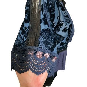 One of a kind handmade designs by Caralina K. This designer went to school with the maker of Johnny Was and gets her fabrics from top designers like Versace, Dolce and Gabbana and hand designs each unique piece of clothing. You will not find another piece like it anywhere. She uses the best in velvet, silk , and cotton. This piece is brand new from her collection. Set includes lace lined velvet shorts with leather tie and an adorable lace, velvet and Egyptian cotton jacket that has two ties in the front. Fabric has stretch and will fit small to medium frame. She does not put tags on her clothing. Beautiful gorgeous set that is absolutely sexy.