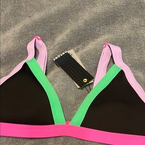 Stylish and vibrant, this colorblock bikini set features a striking combination of pink, green, and black. Perfect for making a statement at the beach or pool.