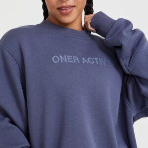 Comfortable Oner Active Classic Lounge Oversized Crewneck sweatshirt in a dusty gray blue. Features embroidered logo words on front and logo detail on back.