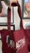Stylish burgundy tote bag with bold white lettering. Perfect for everyday use.