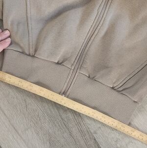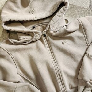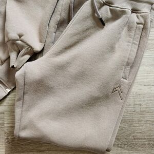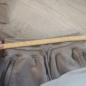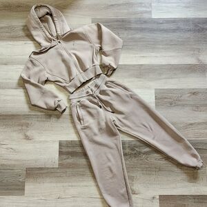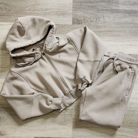 Oner Active set. Cropped hoodie and joggers in minky. I'm not the first owner but these are literally just passing through me. These were sold to me as a size small and they are definitely not. I believe they're extra small. (tags are cut out). Only defects I noticed were two very tiny green dots on one sleeve (hard to see) and a very faint spot on one pant leg (might wash out) These are both pictured.