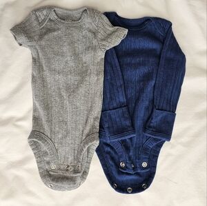 Soft gray ribbed onesie, one long-sleevedand one short-sleeved. Cozy and gentle on skin.