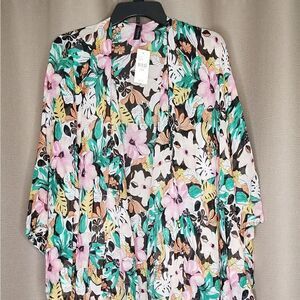 Onessize Lane Bryant Floral Tasseled Scarf Ruana. Labeled onesize , plus size ranges from sz 14 - sz 28. Measurements approximately seam to hem in middle of garmet 35" under arm seam to under arm seam 46" & arm opening approximately 15"