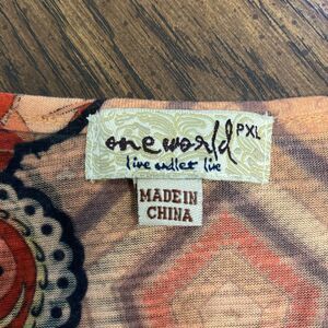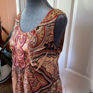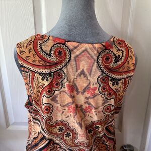 Add a splash of color and a touch of bohemian style to your wardrobe with this beautiful One World blouse. Featuring a scoop neckline and sleeveless design, this blouse is perfect for any season. The collarless top is made of stretchy polyester material that fits comfortably, while the paisley pattern and multicolor accents give it a unique and playful look.