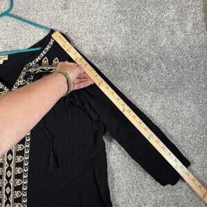 Style/Design: V-neck with tassel ties; 3/4 sleeves with elastic cuffs; ornate front and neckline embroidery; relaxed, flowy fit; slight high-low hem; lightweight crinkle texture
