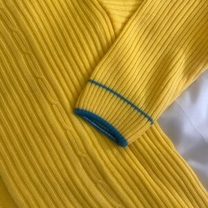 Vibrant yellow sweater with ribbed texture. Features blue trim for a stylish contrast. Ideal for cozy wear.