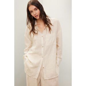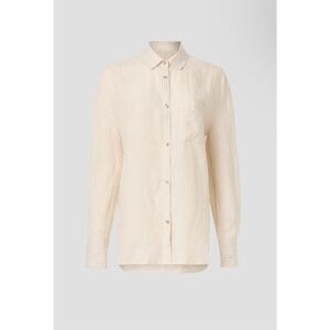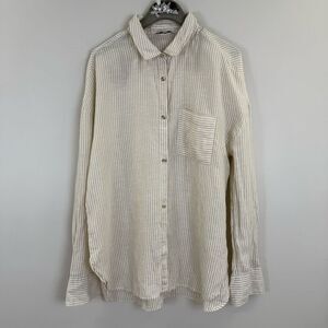 Off-white striped (50% Linen, 50% Lyocell). Tops. Long sleeves. Collared neckline. Front button closure. 32" from shoulder to hemline.