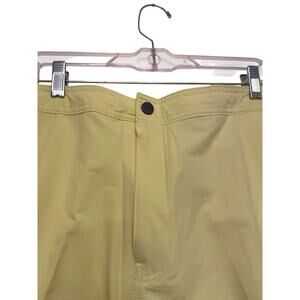 Citron yellow. Button and zip closure. Elastic drawstring waist.