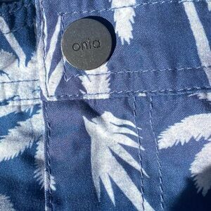 Onia Calder Blue & White Palm Tree Print Swim Trunks. Size Small (30) Excellent pre-owned condition. Ships from a smoke and pet free home.