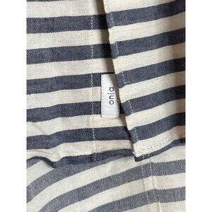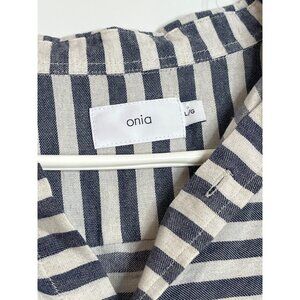 Elevate your wardrobe with this Onia linen blend shirt featuring a stylish button-down design and versatile high-low hem. Perfect for casual or semi-formal occasions, this gray and white shirt offers both comfort and elegance for a contemporary look.