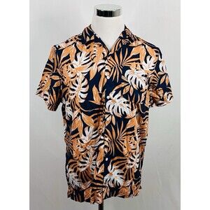 Onia Medium Hawaiian Aloha Shirt Navy Blue Orange Floral Palms Cotton Blend