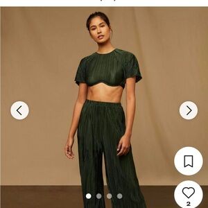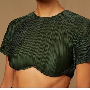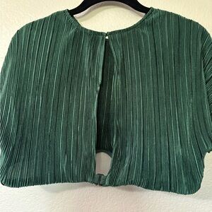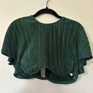Onia Plisse Forrest Green Ribbed Flutter Sleeve Crop Blouse with Open Back.