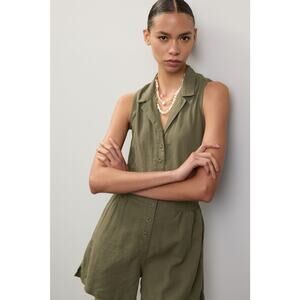 Onia Sz Xs Olive Green Sleeveless Front Button Collared Linen Romper 1 pc