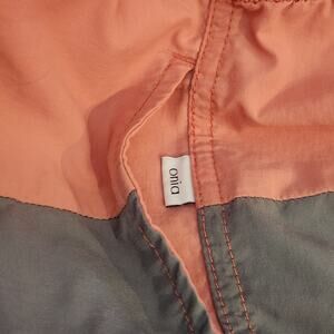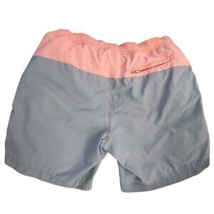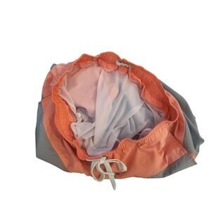 These gray & coral colored Onia swim trunks are in great pre-owned condition with the exception of a couple of very light and small marks. They may come out with some stain treatment. You can see this in my last picture. They are elastic waist with drawstring. They have 2 side pockets and one zipper close back pocket.