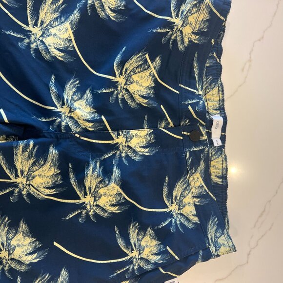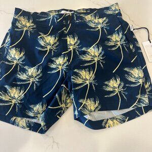 Brand new with tags. Onia mens swim trunks elastic waste in back yellowish green palm trees on navy blue trunks