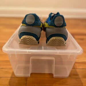 Brand NEW, with TAGS, never worn. Blue nylon with teal suede overlays, yellow side stripes, and blue laces, giving it a vintage athletic look. One of Onitsuka's classic retro running styles.