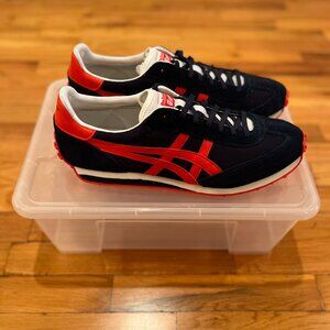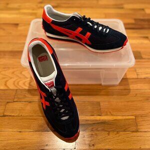 Brand NEW, never worn. Retro running-inspired model from the Japanese brand Onitsuka Tiger (predecessor of Asics). Mostly navy blue mesh, with navy suede overlays around the toe, laces & heel. Stripes are bright red synthetic leather.